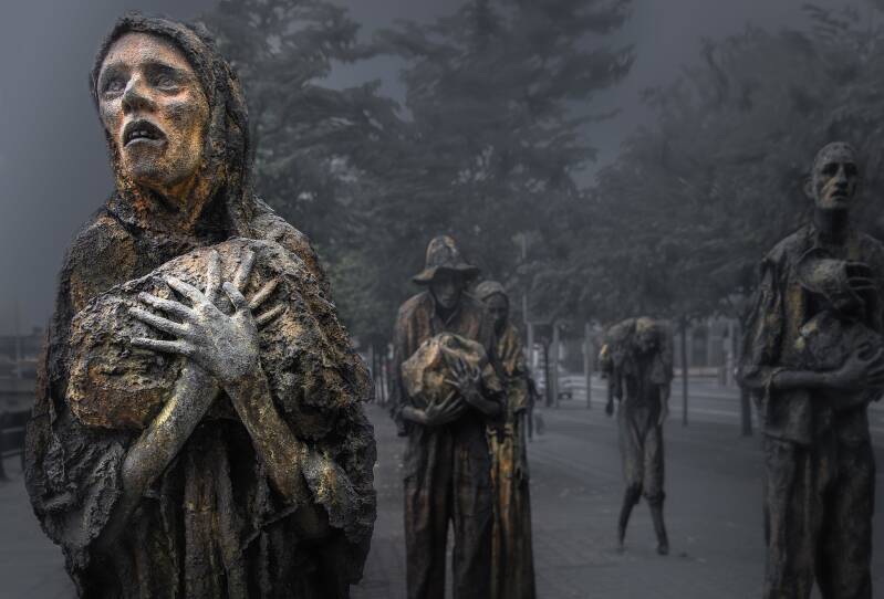 Ailleurs dans le monde, les famines accompagnent souvent la domination coloniale et l’intégration forcée aux marchés mondiaux. En Irlande, la grande famine de la pomme de terre (1845-1852) n’est pas seulement une crise agricole : elle est aggravée par les politiques britanniques, l’exportation continue de denrées et l’absence de secours suffisants. Un million de morts, un million d’exilés : la famine transforme durablement la société irlandaise.