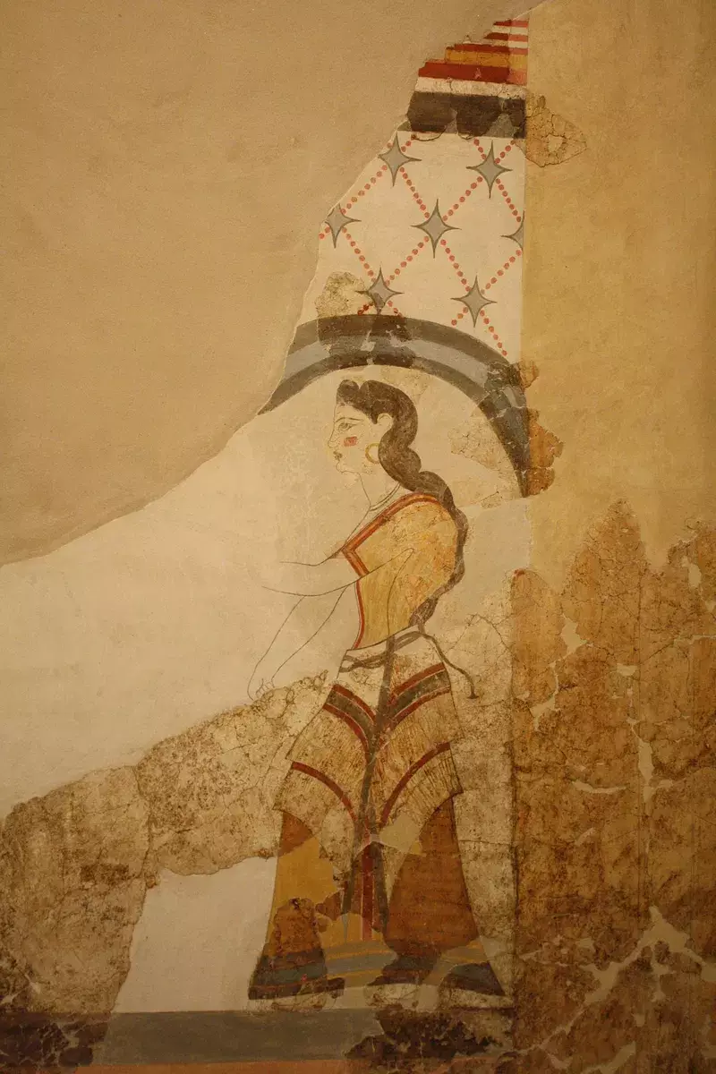 Détail de la fresque datant de l'âge de bronze minoen sur le site archéologique d'Akrotiri dans l'île de Santorin, en Grèce.