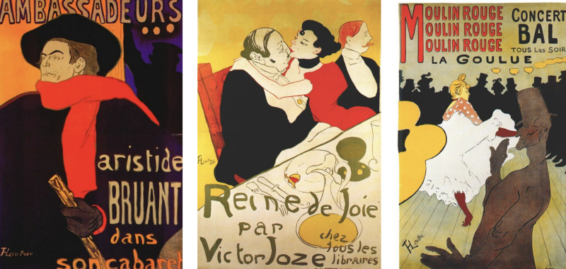 Les affiches de Toulouse-Lautrec sont mondialement connues. Elles capturent l’atmosphère vibrante du Paris de la Belle Époque, en particulier le monde des cabarets, du cirque et des maisons closes. Ses œuvres publicitaires, influencées par l’estampe japonaise et le mouvement Art nouveau, sont devenues emblématiques de la vie nocturne parisienne.