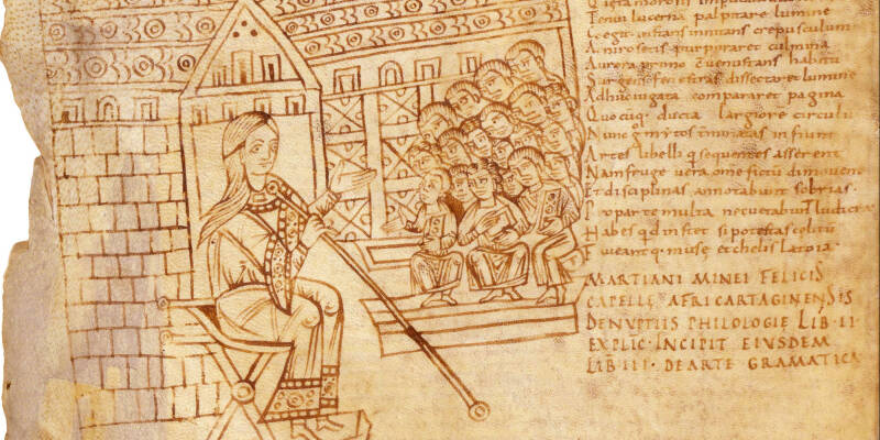 Dans la salle de classe, proche de l’église, les enfants sont sagement assis, une tablette entre les mains. Ils écoutent une jeune femme avenante, la Grammaire, leur expliquer les règles du latin. Cette illustration orne les pages d’un ouvrage de Martianus Capella, maître à Carthage au 5e siècle : ce manuel « scolaire », rédigé en prose et en vers, connaît un immense succès tout au long du Moyen Âge.