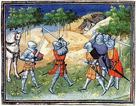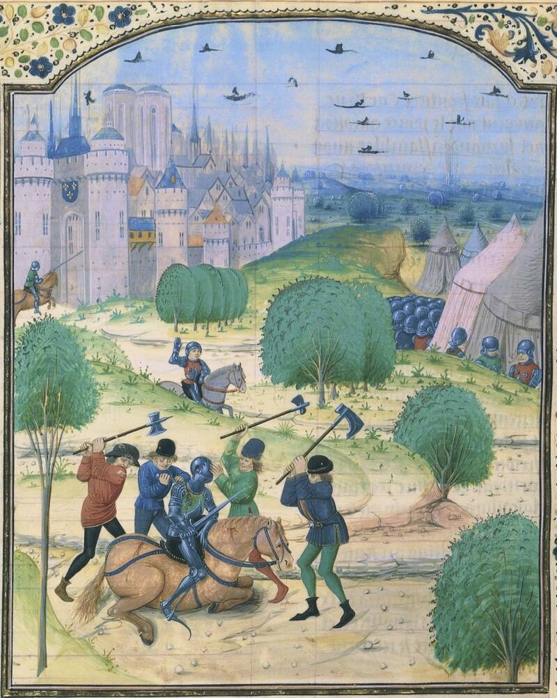Des insurgés tuent un chevalier, miniature du XVe siècle.
