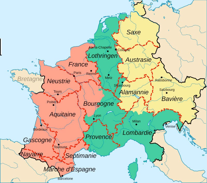 Quand Louis le Pieux, le fils de Charlemagne meurt, l’Empire est divisé entre ses petits-fils selon le traité de Verdun de 843, donnant naissance à trois royaumes distincts : la Francie occidentale de Charles le Chauve, la Francie médiane de Lothaire et la Francie orientale de Louis le Germanique. La Francie occidentale deviendra plus tard la France tandis que la Francie orientale évoluera pour devenir le Saint-Empire romain germanique,. Le royaume de Lothaire finira par disparaître en tant que tel, absorbé en partie par les deux autres.