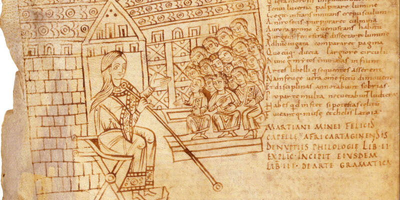 Dans la salle de classe, proche de l’église, les enfants sont sagement assis, une tablette entre les mains. Ils écoutent une jeune femme avenante, la Grammaire, leur expliquer les règles du latin. Cette illustration orne les pages d’un ouvrage de Martianus Capella. Ce manuel « scolaire » connaît un immense succès tout au long du Moyen Âge. Source : Bibliothèque nationale de France
