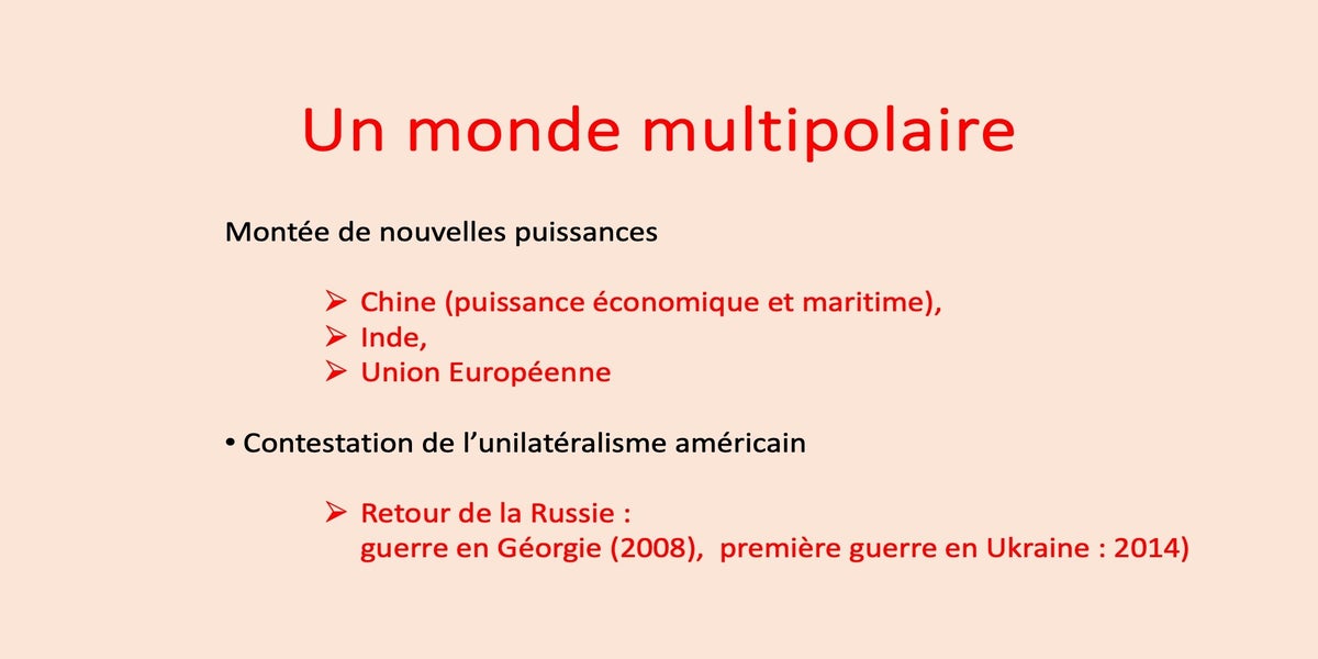 • Monde multipolaire : plusieurs pôles de puissance (USA, Chine, Russie, UE, Inde…).